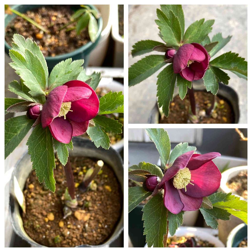 シンプルイズベスト。こちらが黒系のクリスマスローズを買いに行ったのに何故か赤を買っちゃったのよね…という苗です。この蕾が私を呼ぶように夕陽を浴びて一輪ピカリと光っていたのです。一期一会😊。