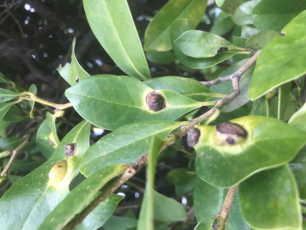会社の緑地に植えてある樹木なのですが、名前なんと言うのでしょうか!また、変な虫が付いたような後がありますが、何の虫でしょうか!