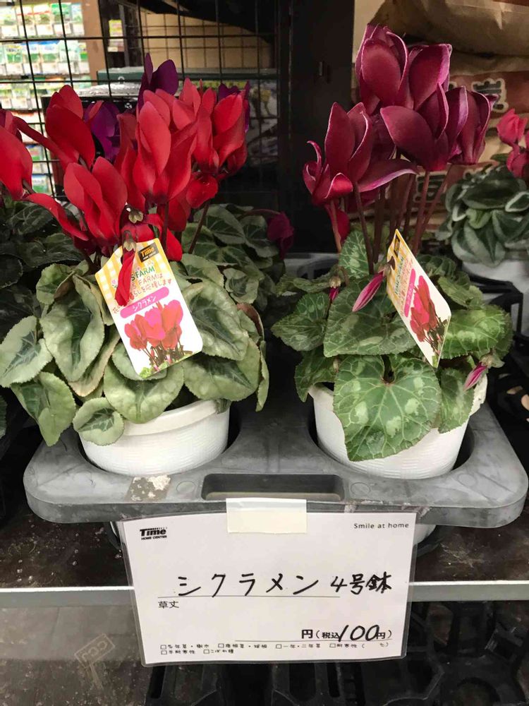 会社の帰り道に少し寄り道したホームセンタータイム西市店でシクラメンが100円(税込)で売っていましたよ!😱