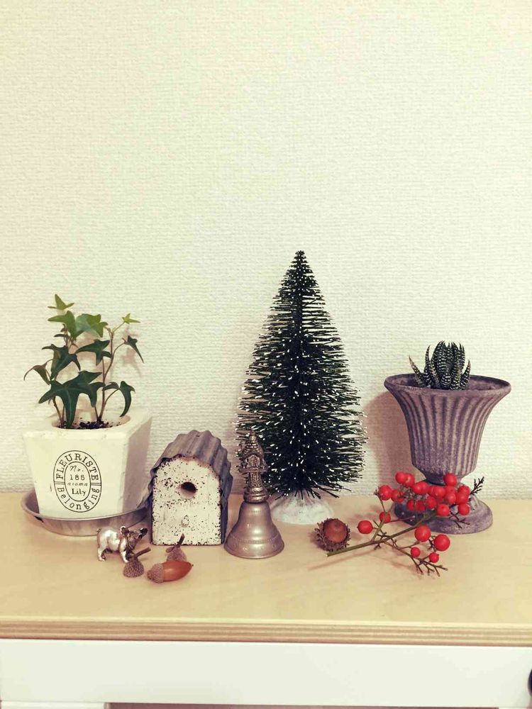 クリスマス風ディスプレイ☆南天の赤い実もどんぐりも本物♪真ん中のツリーだけフェイクです!