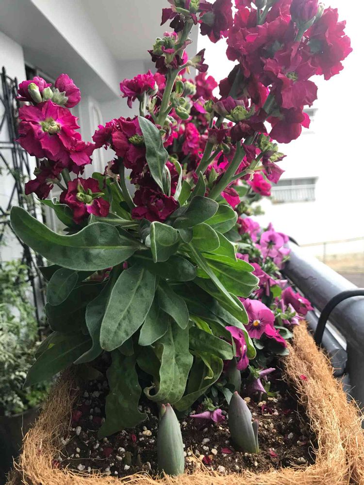 ストックとビオラでぎゅうぎゅうのハンギングバスケットに