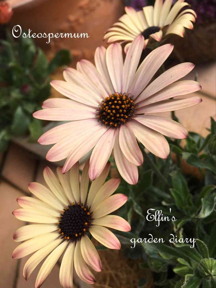 ネットで見つけたお菓子のような可愛い色合いのオステオスペルマムを探していたから、すぐに目に止まり…いくつか微妙な違いであった中から選んだオステオスペルマムです。縁どりがうっすらピンクな所も可愛いです~💕
