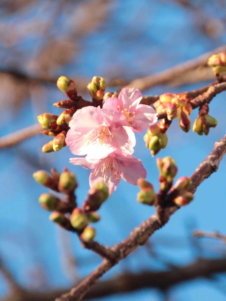 寒緋桜は花軸が伸びて、房咲きで花が下に垂れ、もっと色が濃いので、多分河津桜でしょう。