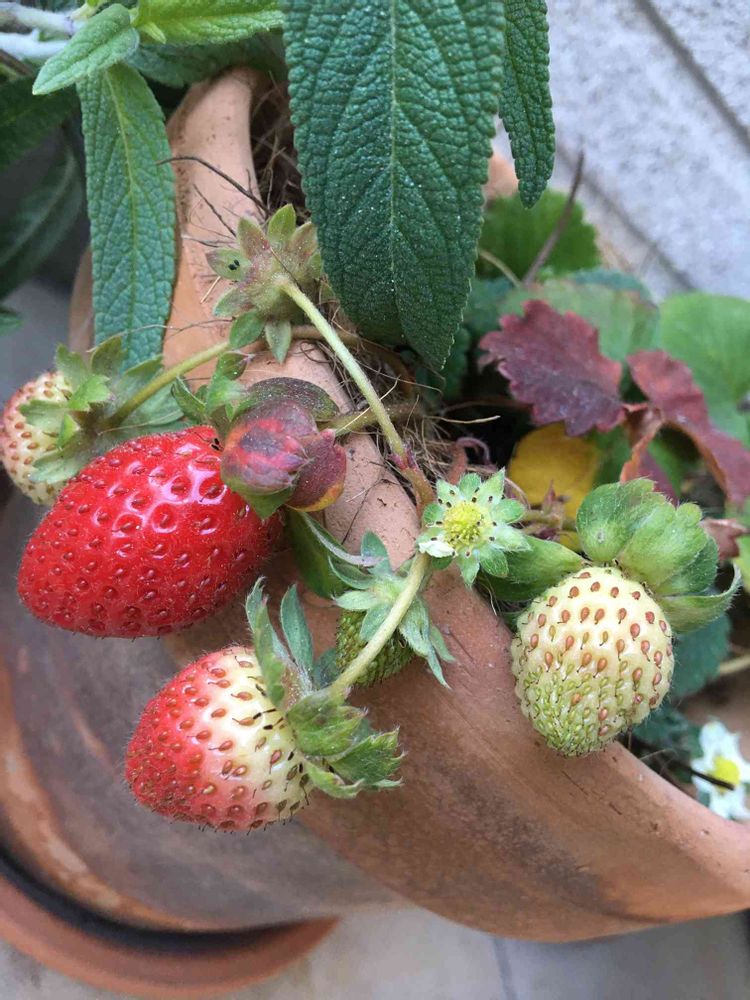 鉢植えの苺が色づいています。たくさん花を咲かせると苺が小さくなるのでしょうか?見てるだけでなかなか食べる事ができません