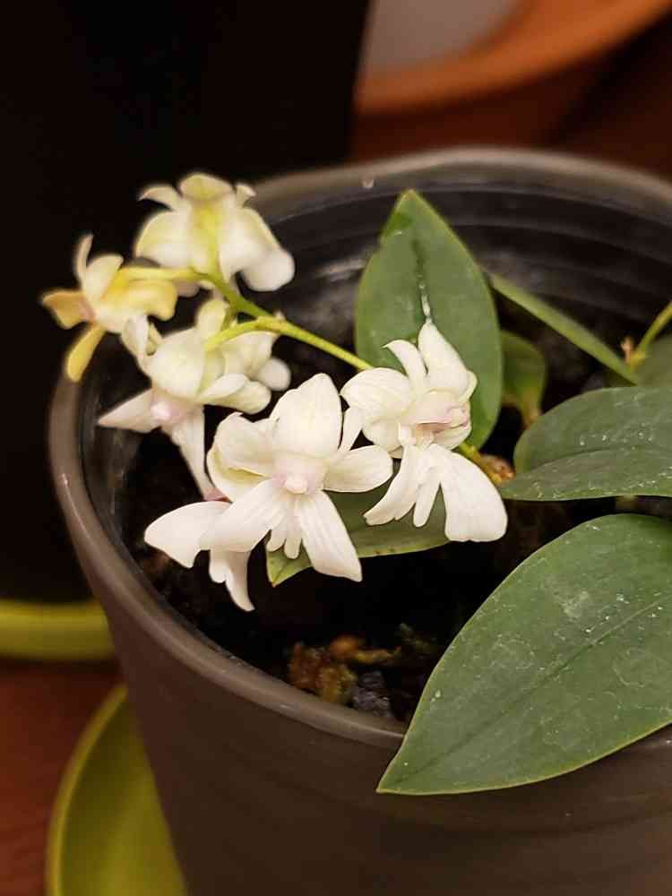 まだハルミさんは咲いていないけど、花見本から見るにこちらのアベランスの方が花の形は可愛い系かなぁ😊ハルミさんは、バルブの根本に細い部分があって少しだけ高さがあるけど、こちらは丸くてコロコロした小さなバルブが水苔にくっついているようなイメージ。高さはほとんどないミニサイズのラン🌱