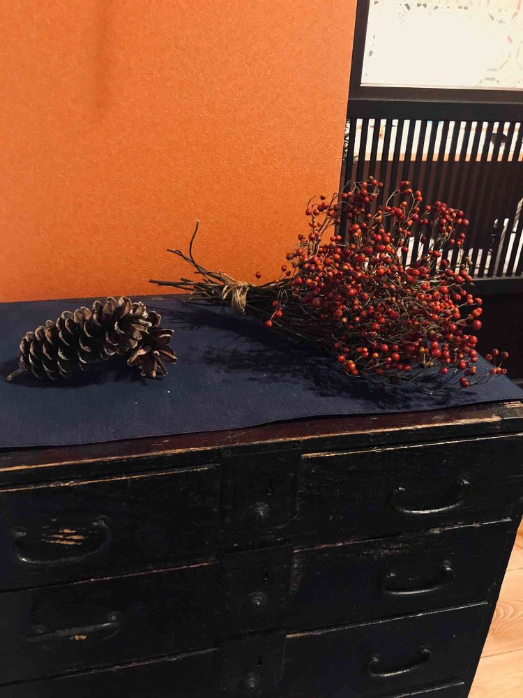 壁の色も、家具も、そしてバラの実と松笠の配置も…