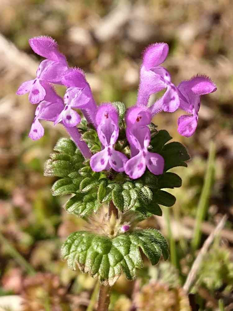 シソ科オドリコソウ属の2年草。道端、空き地、土手など至るところで見かけるが帰化植物ではなく在来種。根にVA菌(💬根の内部に潜り込み、糖分などをもらう代わりに、貧しい土壌から水分と養分を探して供給する微生物。花作りに不可欠なリンの回収が得意)が共生するため痩せ地にも生える。長さ約2㎝の濃いピンク色の唇形花が咲く。花には上唇と下唇があり、下唇には昆虫への蜜標となる模様が入る。花期は春だが、暖地や日当たりのよい場所では冬でも開花している。濃い紫色の小さな球形の部分は花が開かず自家受粉して種を作る閉鎖花で、冬は特に多い。種にはエライオソームが付いていてアリが運ぶ。