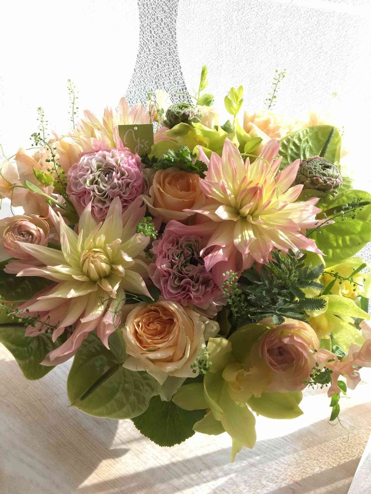 ダリアを入れて、優しい色合いのアレンジメントです。