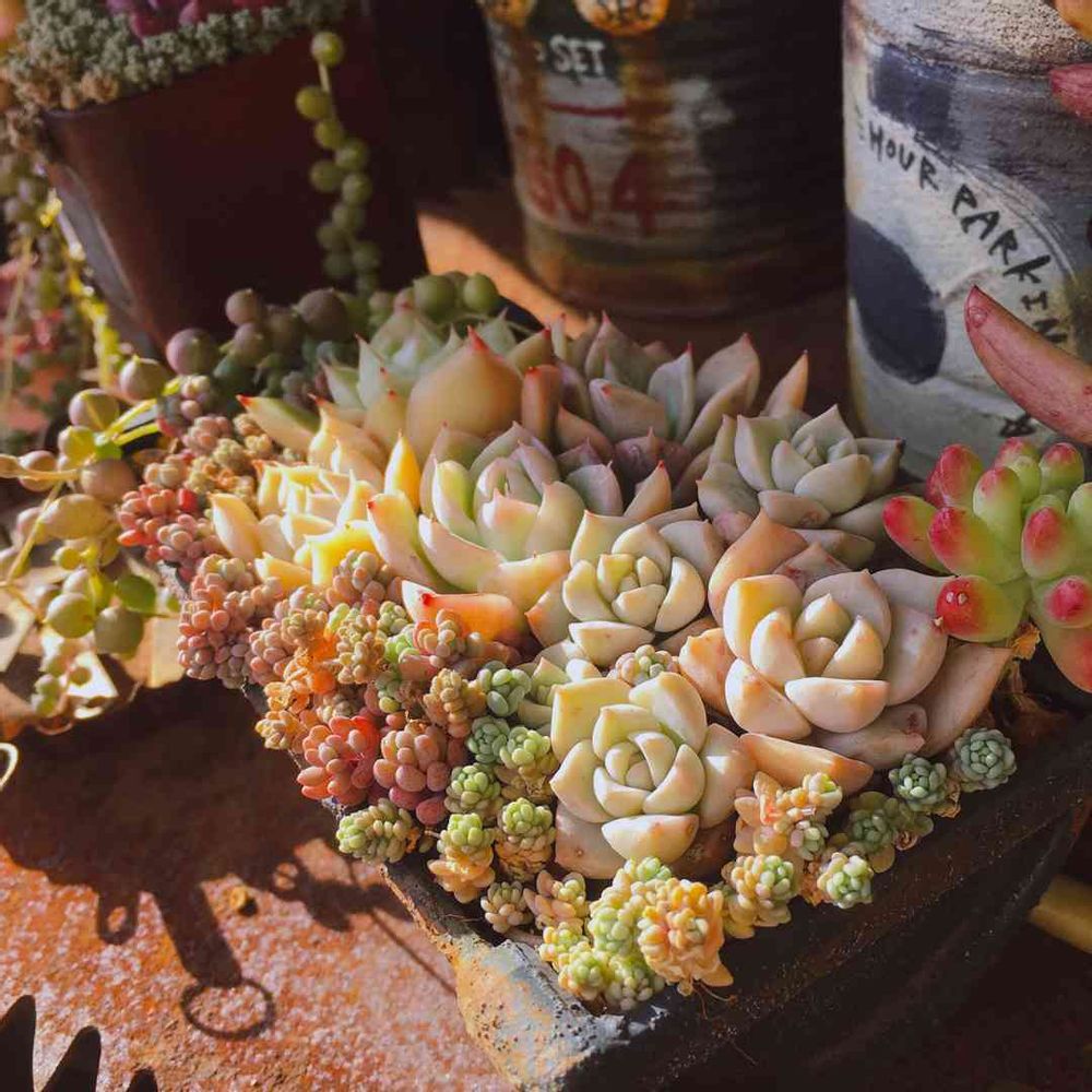 セダム畑の子たちがふんだんに使われて、何か鉢の枠を超えた一体感が素敵です✨