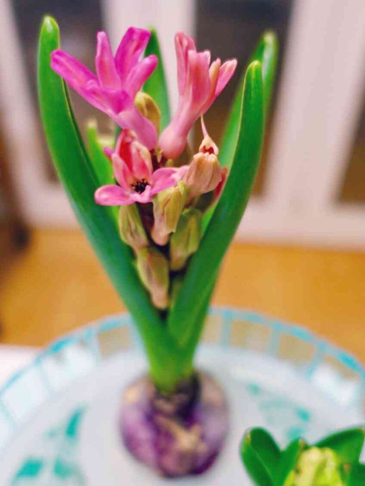 咲きました❣️ヒヤシンス開花第一号は、可愛いピンク色で、ちょっと変わった花みたいです。香りは控え目ですが、良い香りです。