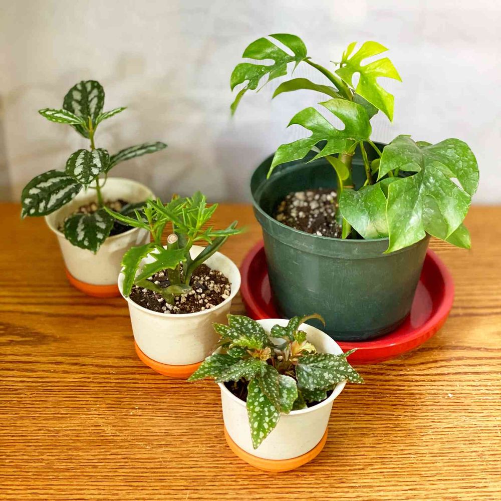 新しく加わった植物たち。右の大きいのはモンステラ・ミニマ。左の三つも名前わかりました!上=アルミナム・プラント、中=カランコエ・ラシニアータ、下=ベゴニア・ファニー・モーザーだと思います。カタカナだらけですみません😅