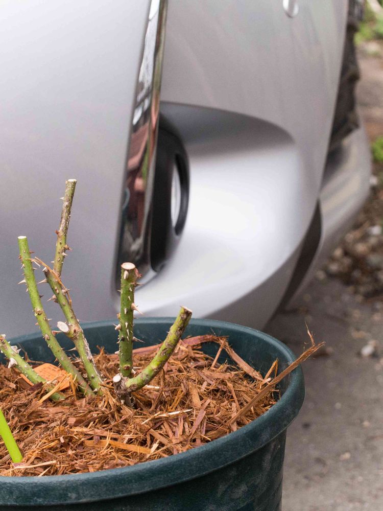 鉢植えのフロリバンダ フランクリースカーレットは剪定マルチングを施した