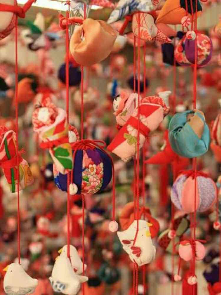 地元のご婦人方がご自宅からはぎれや着物の古布を持ちより、人形や動物、縁起物などを作って繋ぎ合わせて吊るし、健やかなこどもの成長や幸せを願う「つりびな」