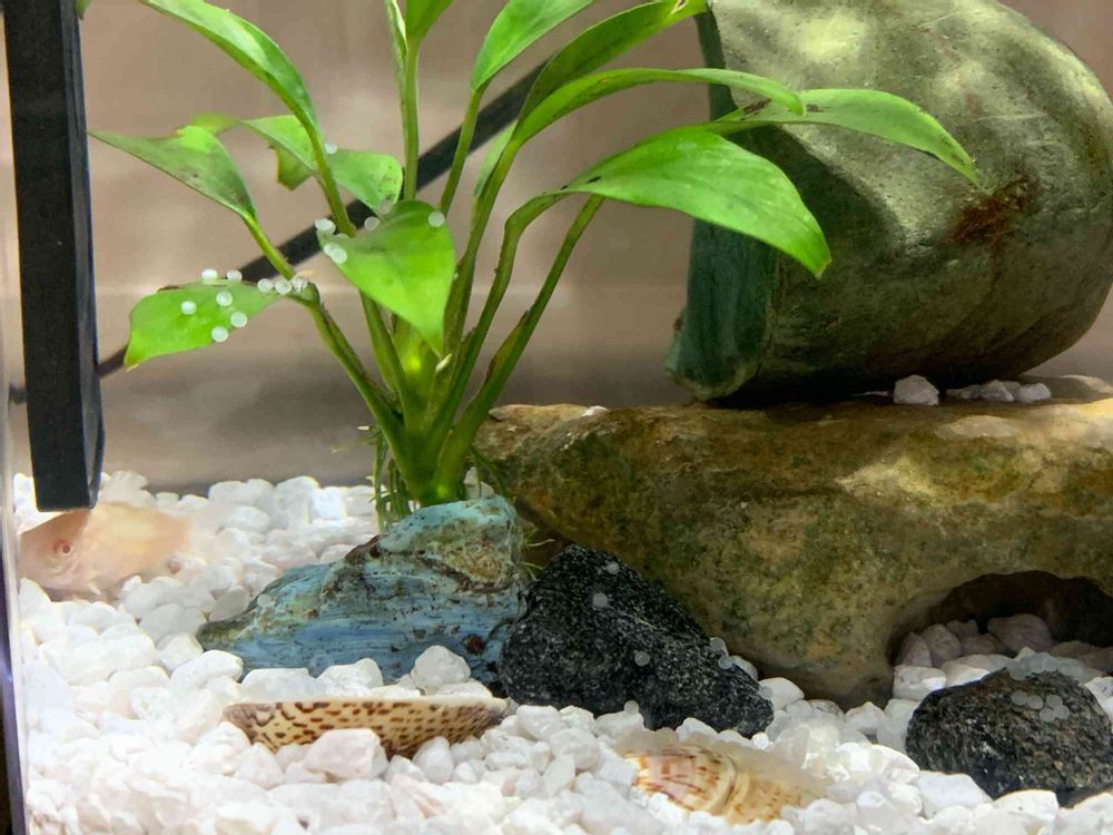 白と緑系のコリドラス達です。 小さなナマズのような魚の卵です。初めて産んだのでそだて方がわからないわ。😅卵はやはり隔離したほうがよいのよね?新しい大きな水槽も買わなきゃだめかなー。