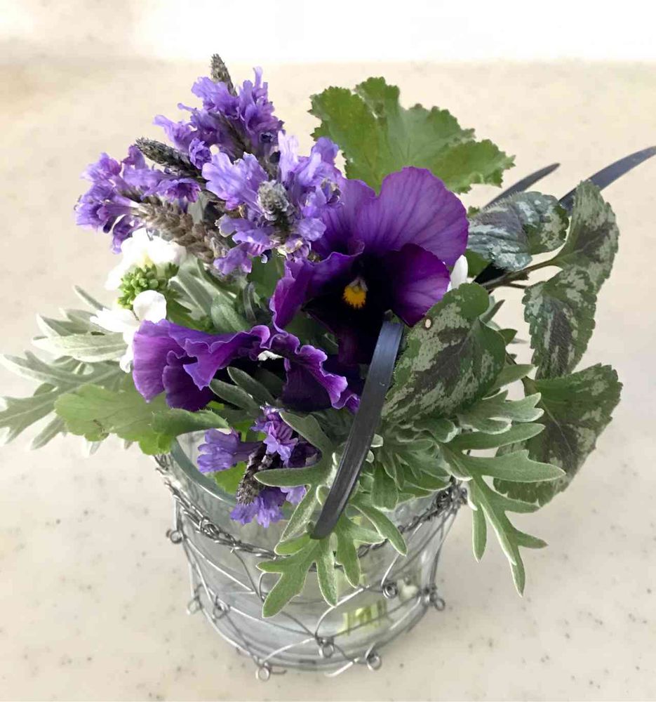 ずっと咲き続けているレースラベンダーと、ビオラを✂️して、庭のグリーンで小さなブーケに束ねてみた〜