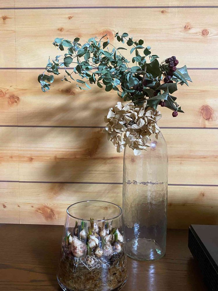 ドライフラワーと芽出し球根をTV台の上に飾ってみました🥀🌱