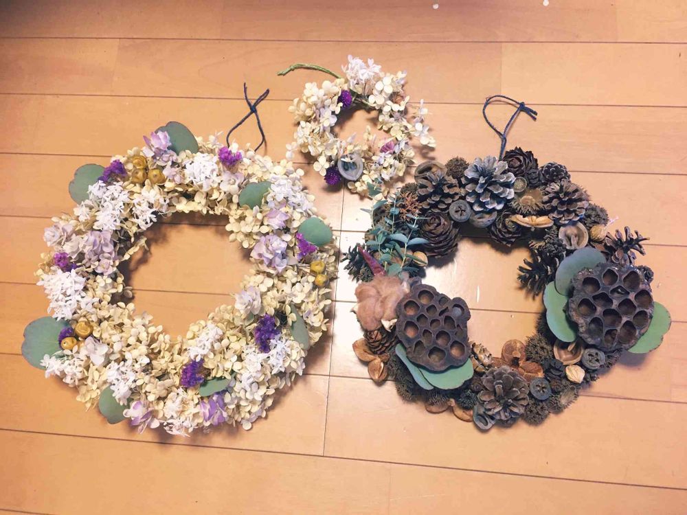 友達と喋りながらリース作りを楽しみました。右が私、左が友達。小さいのは友達の子供ちゃん。