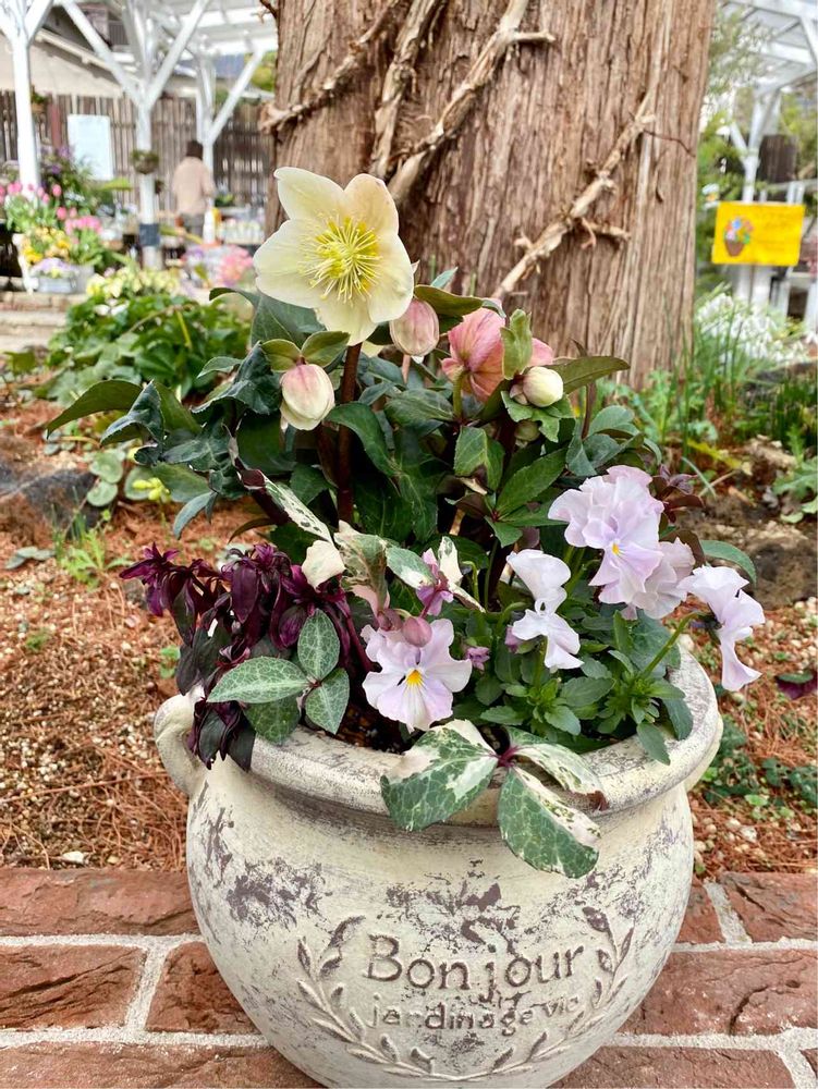 シックな鉢に合った、とても素敵な寄せ植えでしたよ😊🌸🌿