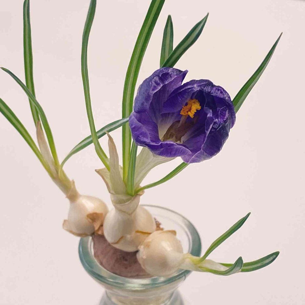 初水耕栽培したクロッカスです。開いてきたけど、花びらに元気がない😢お日様不足だったかな…🤔