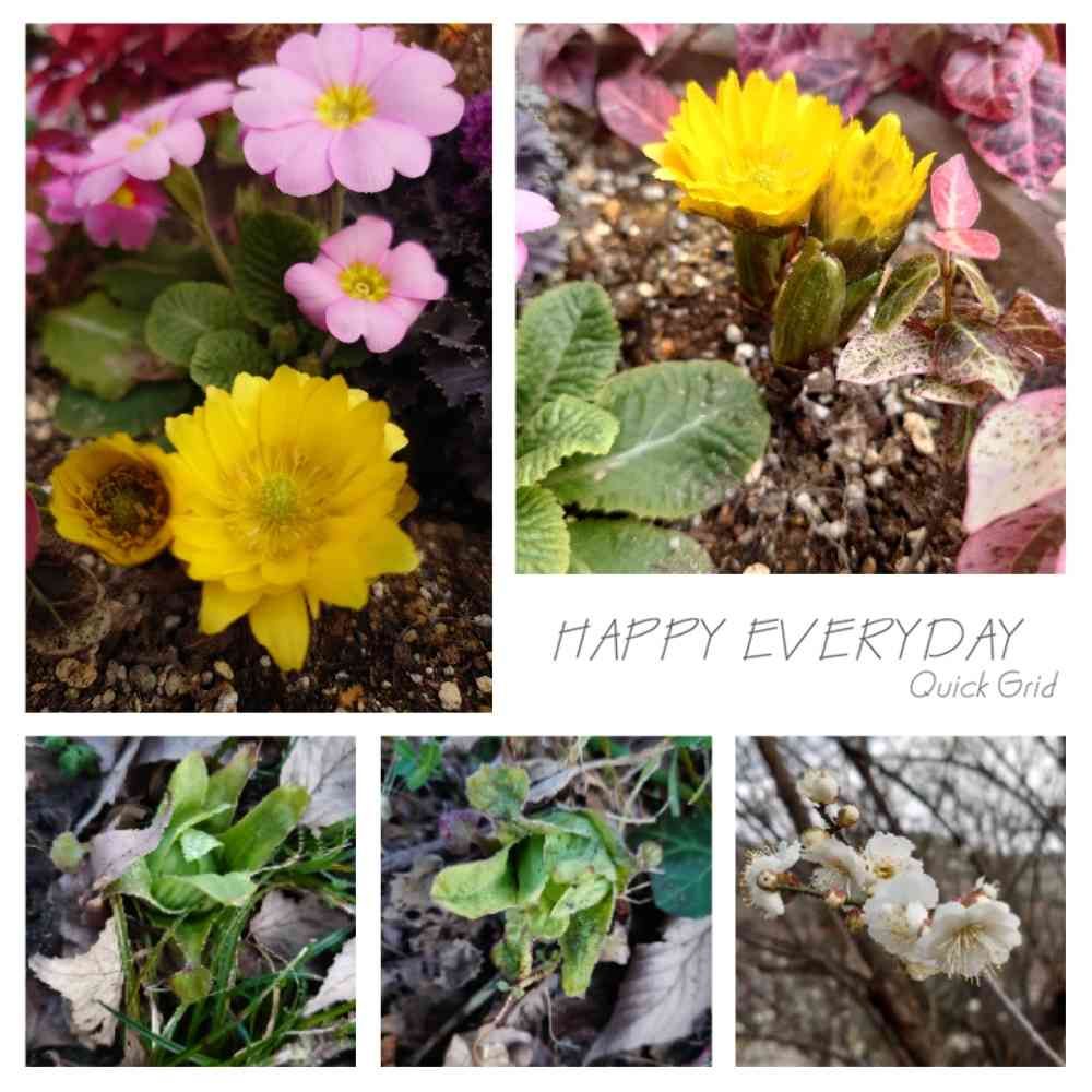 昨日の節分に咲いた福寿草と散歩コースに生えてきたフキノトウと梅です