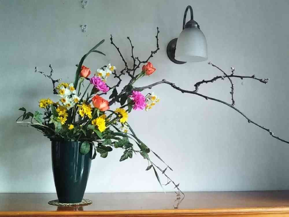 残りものの花材と年末にバッサリ切ってしまったキウィの蔓で春っぽい玄関にしました🤗