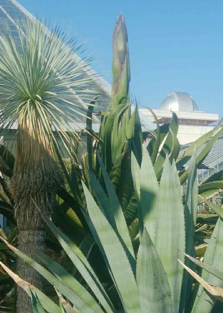 以前からある3mくらいの巨大なアガベ・フェロックスに花芽がそびえ立ってましたビックリ!