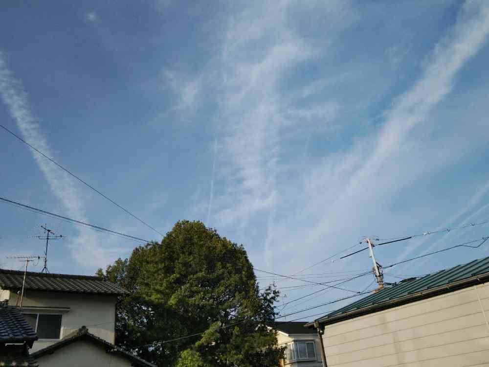 2020.02.04朝の空です。飛行機雲が放射状に広がっていた。
