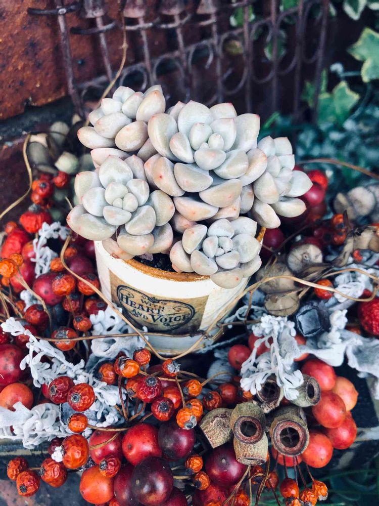 赤い実と白い多肉がマッチしていて、素敵なpicですね。.。❁*.:。❁ ♡多肉は、古い缶に合いますね❁¨̮