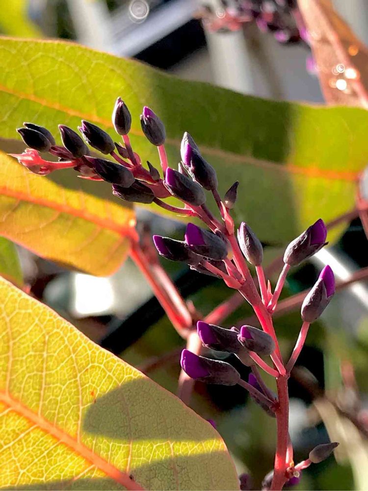 冷え込んだ朝日に当たるハーデンベルギア、もうすぐ咲きそう✨