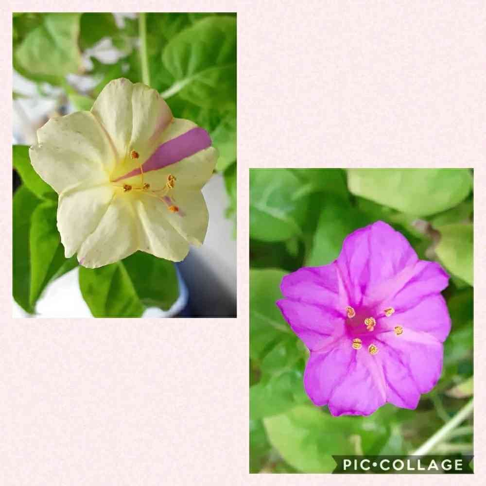 オシロイバナの花が2個咲きました。いつもは1日1個しか咲かないのに今日は珍しく2個咲きました。同じ一つの株から複数の色、柄の花が咲くので面白いです。