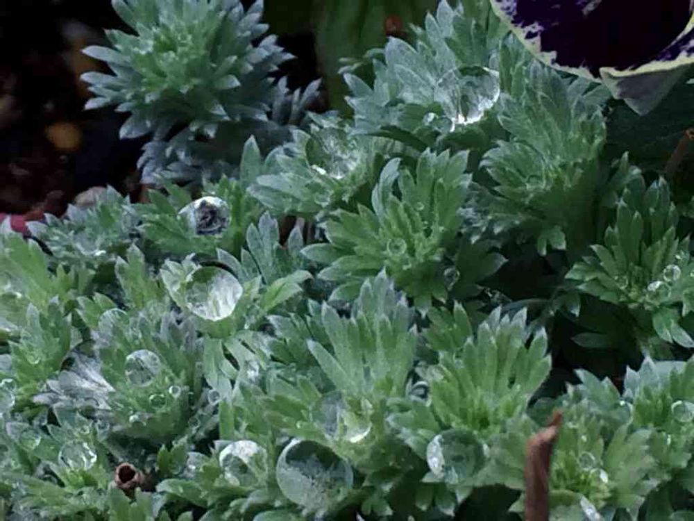 アサギリソウの新芽に久々に降った雨が付いてキラキラ。