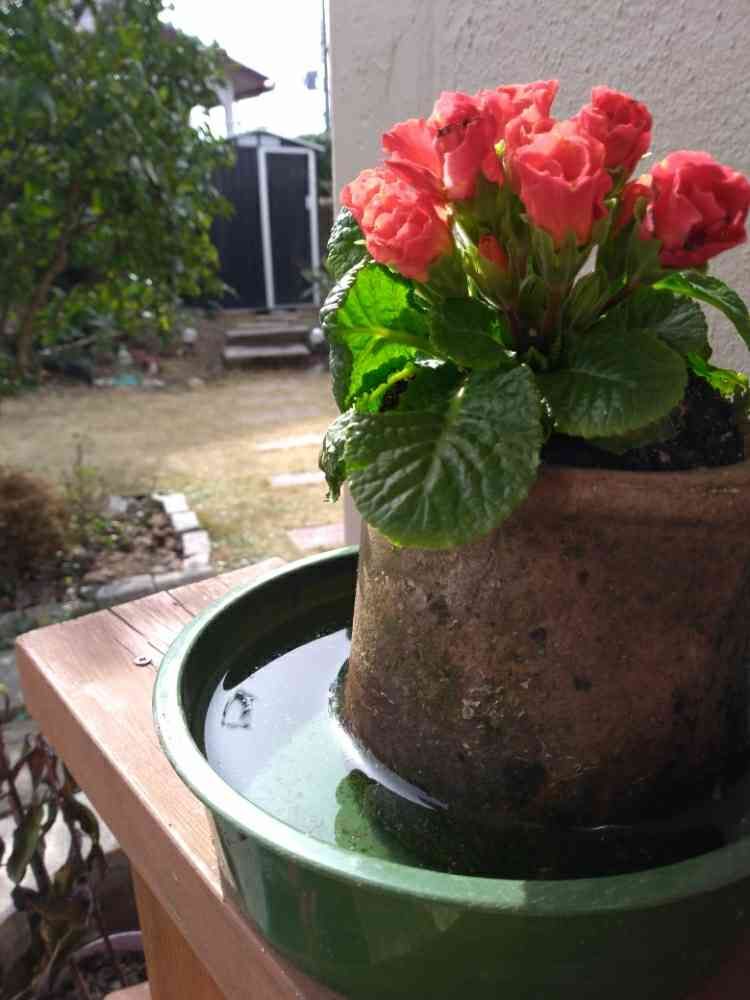 素焼きの鉢に入って、日当たりの悪い玄関先にて元気をなくしていたお花を、日の降り注ぐテラスへ持ってきました。