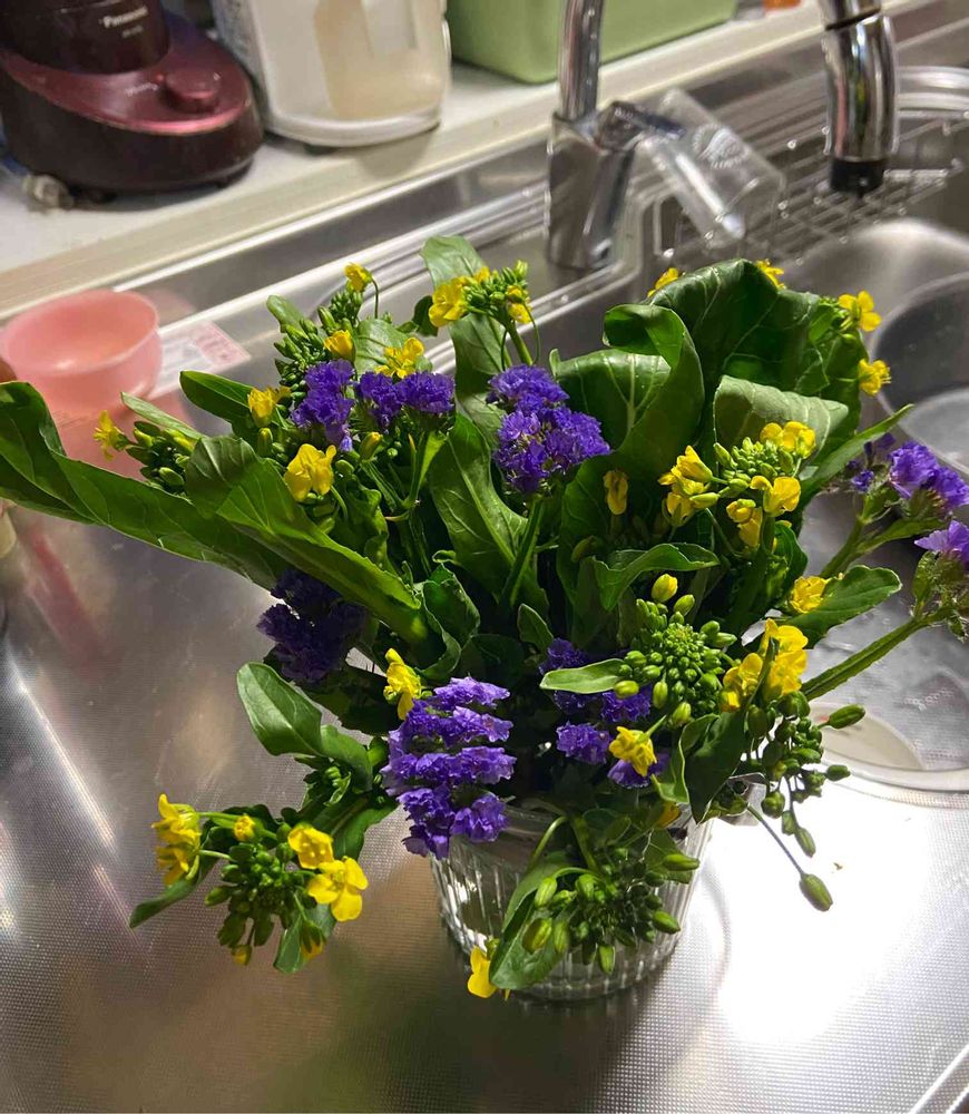 アスパラ菜とスターチスの組み合わせ、素敵ですね💜