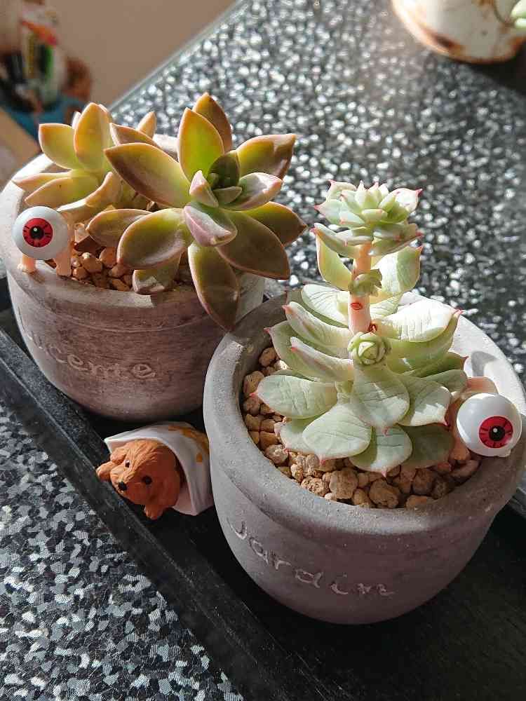 トイプーの置物も可愛い💕 寒いからお布団の中から多肉さんを見守ってるのかな❓🐶💕