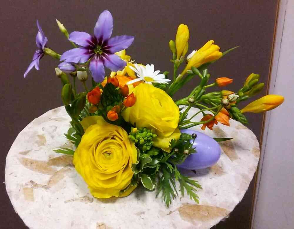 紫のタマゴとリューココリーネがアクセント色になってステキなイースターアレンジね🎶💜💛