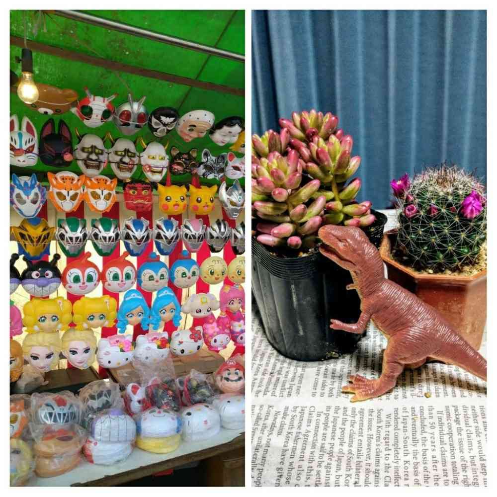左は、お面の露店。ひょっとこ、お多福さん、般若とかなかなかレトロな物売ってるんだな〜😀