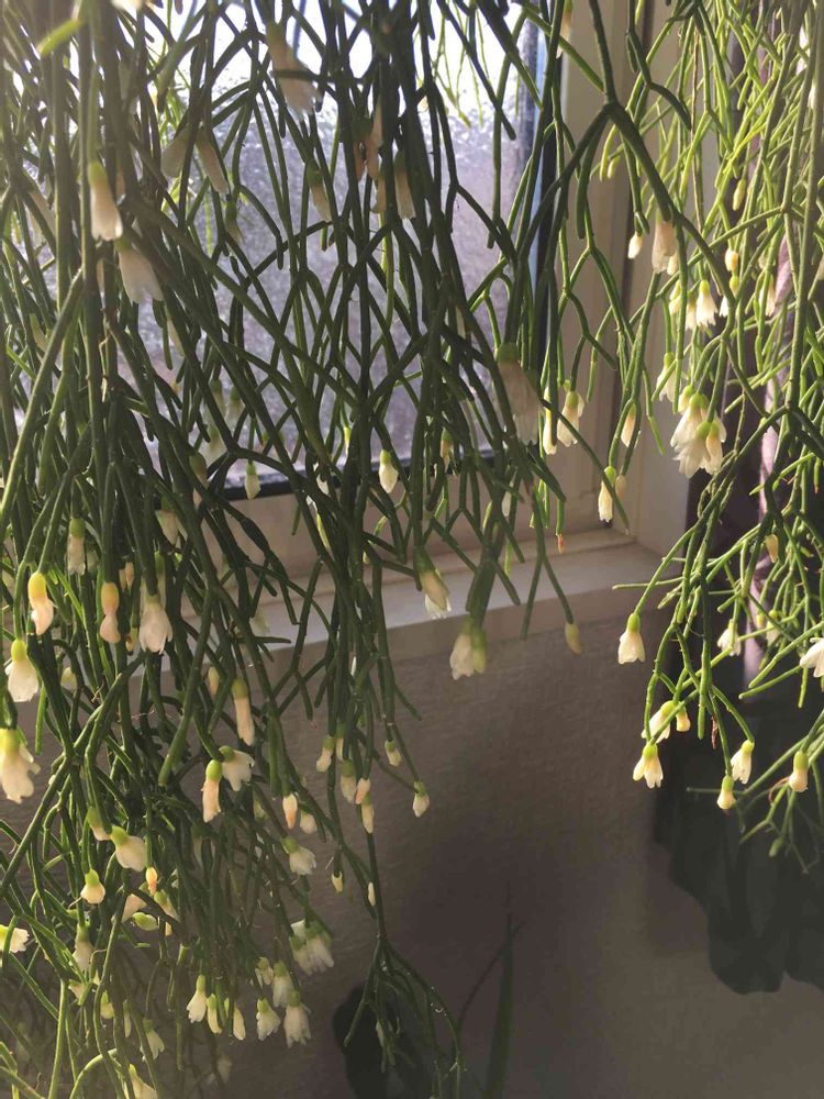 小さい花が終わって落ちても、違う花が開くので長く感じます。リプサリスは直立もあるけど、だいたい垂れ下がって伸びるから、面白いし可愛いです😍❤️👍