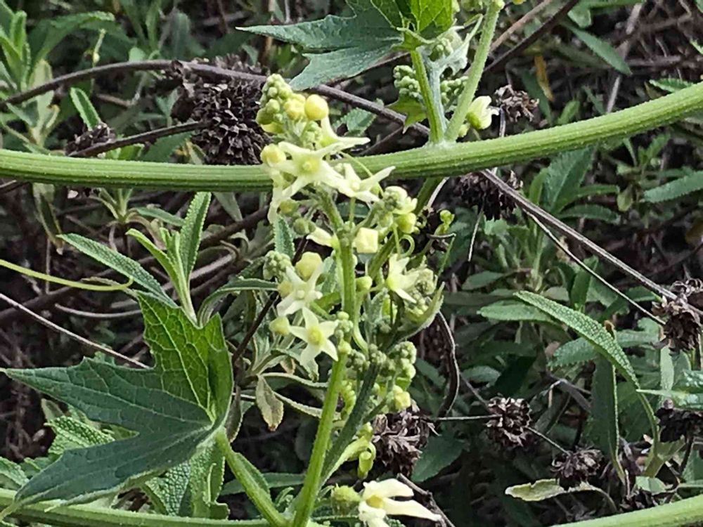Calero parkにて。これもCalifornia manroot。先程投稿した白い花と違い少し黄色がかった感じで形も違います。雄花と雌花があるそうですが、クラスター状になるのは雄花とWikiに書いてあるので、こちらが雄花っぽいです。