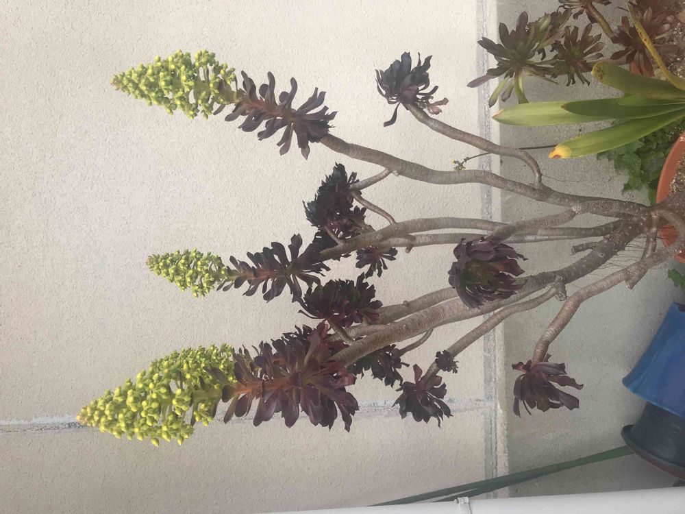 実家の日当たりの良い場所にある鉢植えですが、花が咲いているのは初めて見ました。何年かに1回咲く花なのでしょうか?昔名前を聞いたとおもいますが、母も忘れています。どなたか教えてください。よろしくお願いします🤲