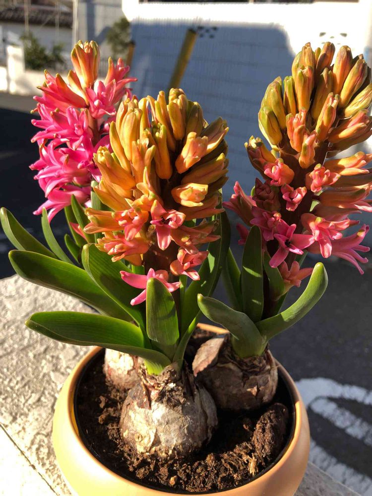 ヒヤシンスが外放置でやっと咲きました。今度はお部屋に入れてお花と香りを楽しみます💕