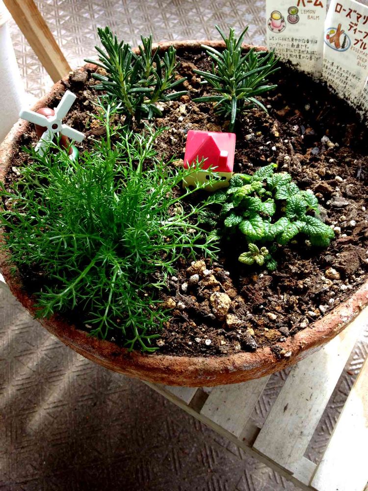 ハーブの寄せ植え鉢、カモミールがよく育ち始めました!家が埋もれ始めてます😅