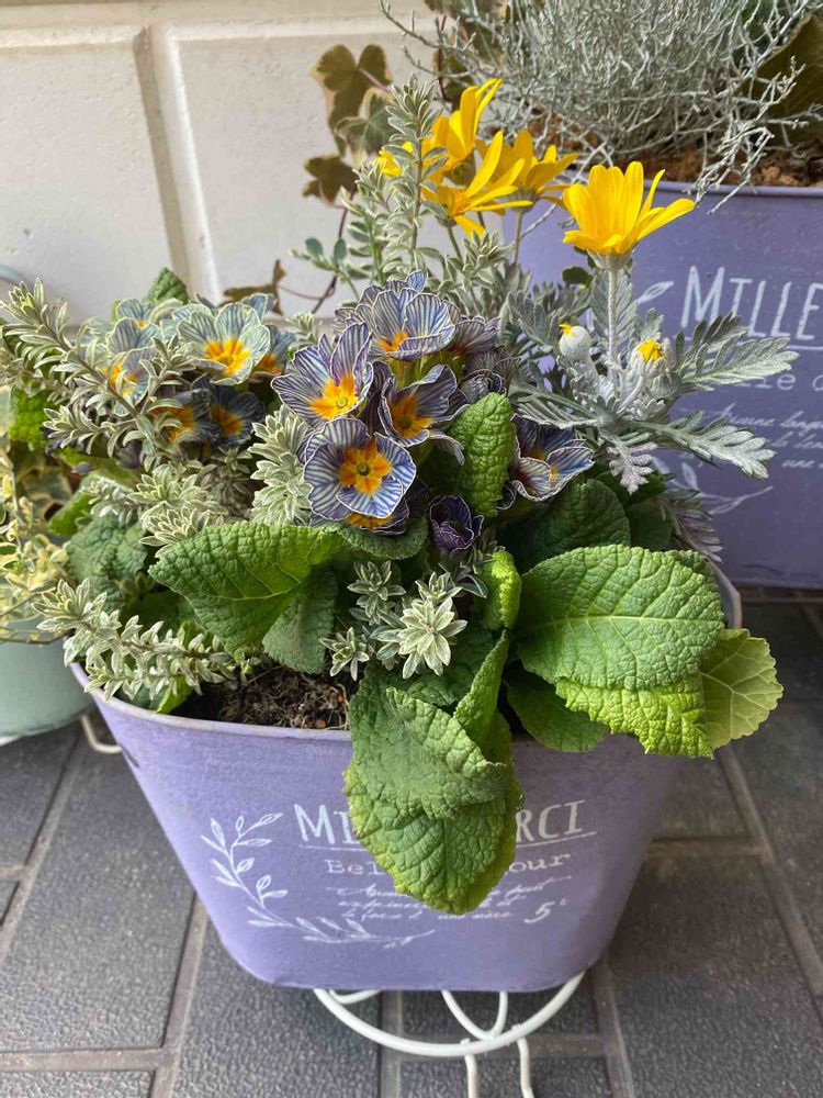 ブリキ鉢小に寄せ植えしました😊黄色のユリオプスデージーが春らしいです💕