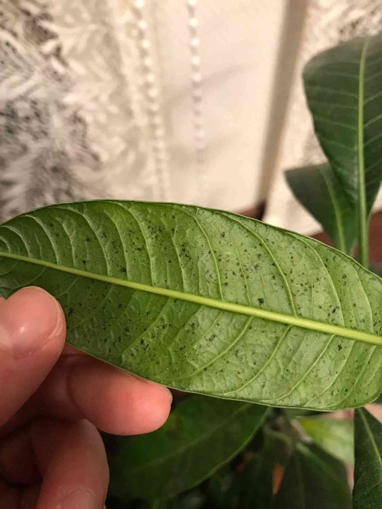 マンゴーの葉(表裏)に黒い斑点がでてしまいました。この症状はどういったものなのでしょうか?対処方法があれば教えていただきたいです😢