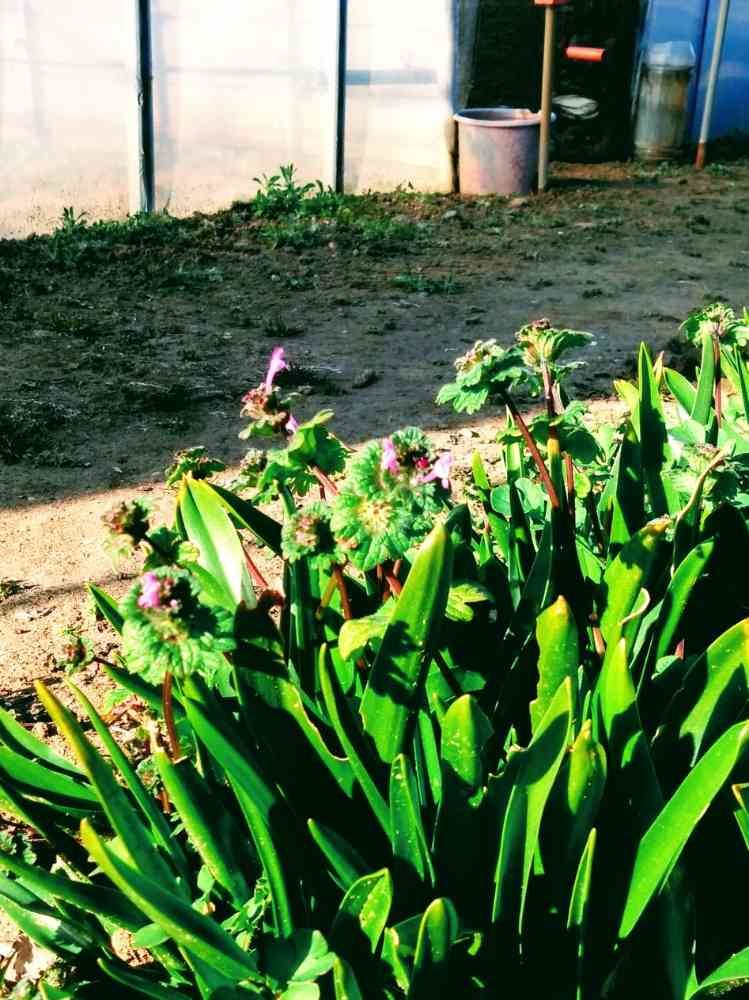 散策の通り道、野菜畑のハウスの前の草花。