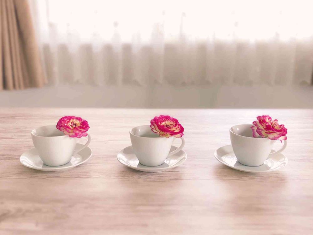 花頭がカップの縁に乗るくらいの高さに切って、投げ入れただけです🤗