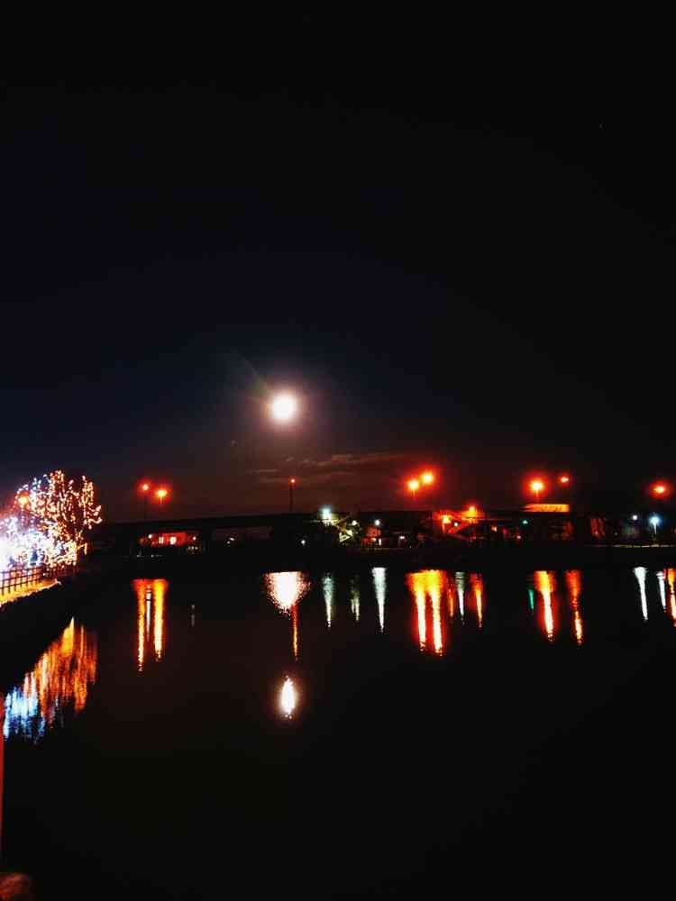 池に映ったお月さまとトンボの街路灯が綺麗✨