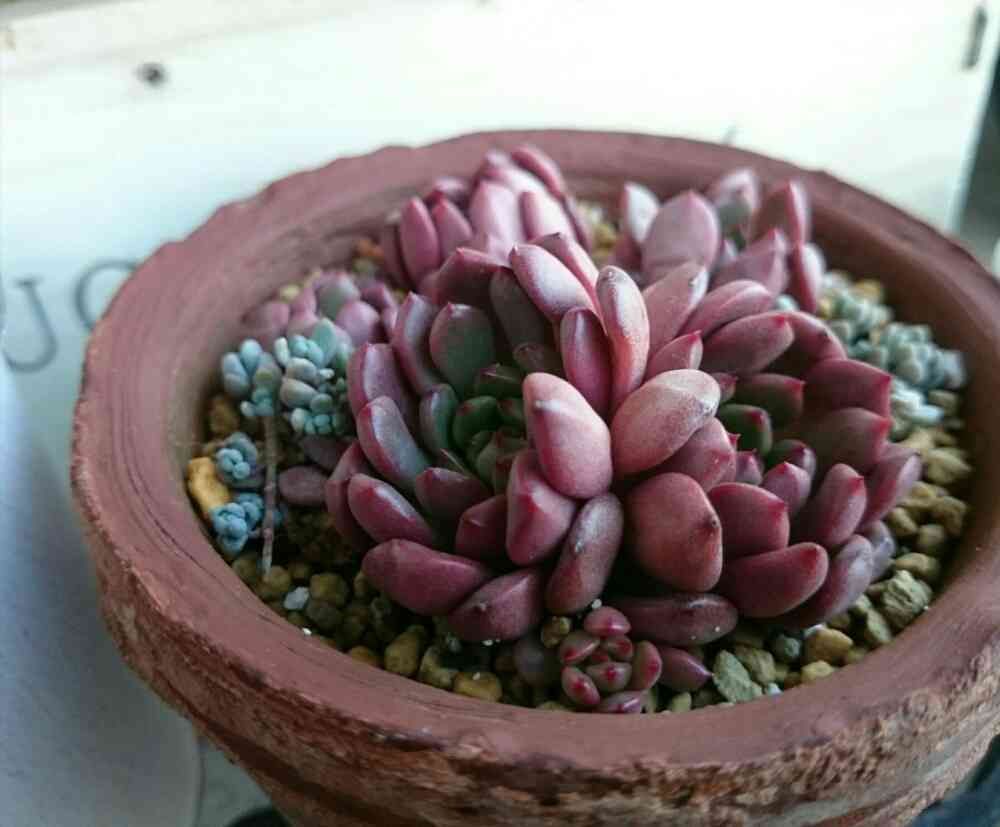 放置気味のピンクルルビー。鉢と土のせいかなかなか肉厚にならないけれど、子株を出して頑張ってくれてる✨
