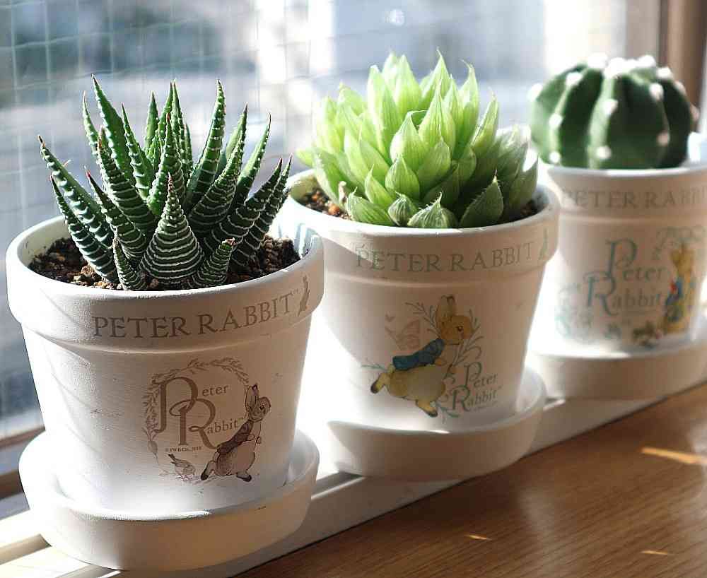 ピーターラビットの鉢、可愛いでしょ?私のお気に入りで、小さなサボテンやハオルチアを植えてみたらピッタリだったよ😊 あまり変化がないけど、お天気悪くて家に引きこもりしてる時は、よくにらめっこしてるの🤭