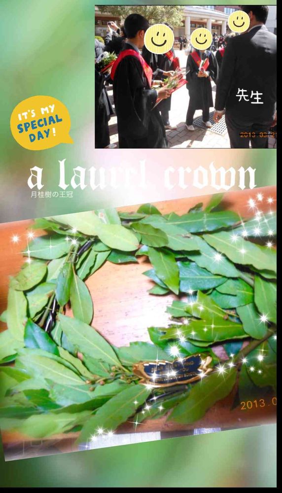 月桂冠🍃🍃🍃被ってガウンとタスキ姿(本人は撮影者)