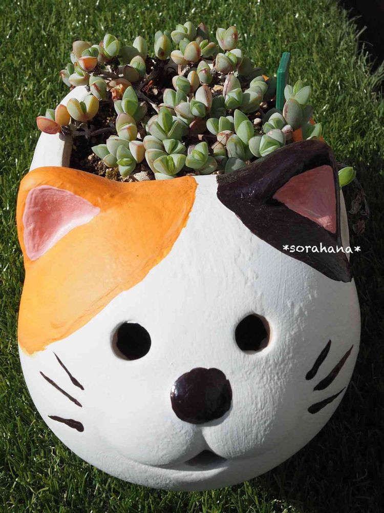 猫型素焼き鉢にペイントして、三毛猫鉢に(ΦωΦ)
